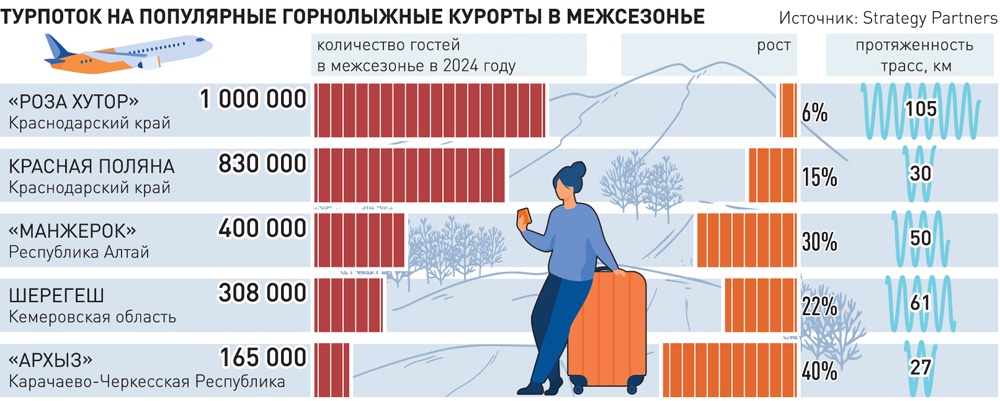 Всего в этом межсезонье более 500 тыс. туристов побывали летом на курортах Кавказа, в некоторых сезон еще идет, сообщает Минэкономразвития. В целом в России из более чем 145 горных курортов 68% работают в межсезонье. Согласно подсчетам Strategy Partners, самым популярным курортом остается горный кластер Сочи. Как отмечают представители группы компаний Mantera, члены Ассоциации туроператоров России (АТОР), по количеству туристов летний сезон в «Красной Поляне» уже сравним с зимним и сейчас курорт позиционирует себя как «всесезонное направление».