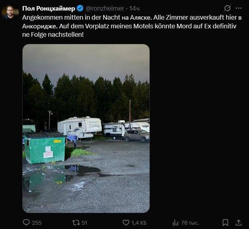«Прибыл посреди ночи на Аляску. Все номера распроданы здесь, в Анкоридже. На площадке перед моим мотелем «Mord auf Ex» (немецкий криминальный подкаст) определенно мог бы снять эпизод!» – жалуется Пауль Ронцхаймер.