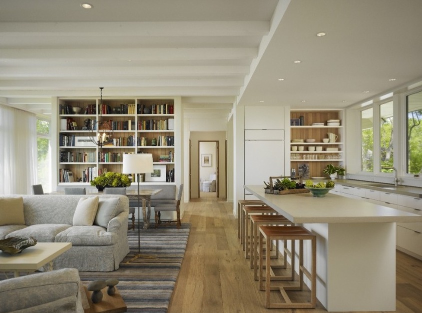 — Стеллажи: Используйте стеллажи, которые могут служить как местом для хранения, так и визуальным разделителем между секциями. Открытые полки сохранят ощущение проветриваемости воздуха, но все же помогут создать отдельные зоны.
